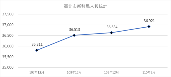 於疫情爆發之前,臺北市政府觀光傳播局「來臺旅客在臺北市之消費及動向調查」指出,106年至108年間來臺觀光人數自976.3萬人成長至1042萬人(圖1)。其中,來臺旅客到訪臺北市比率為87%至90%,且來臺國際觀光客超過八成以上會在臺北市活動且停留約3.45日至4.22日 (臺北市政府觀光傳播局,2017~2019)。此外,臺北市新移民人數每年約有近3萬6千多位新移民居住在臺北市 (圖2),且108年已有60595位國際移工(46999位藍領移工、13596白領移工)於臺北市工作 (臺北市勞動力重建運用處,2019)。由上述統計可知若不包括短期停留之國際觀光客人數及來臺北市求學之國際學生,因生活或工作需居留(180天以上)之外籍人士人數已將近10萬人。